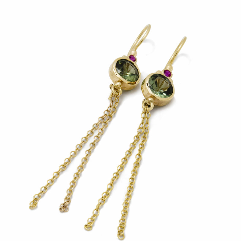 EG2217A Elegant Gold Drop Earrings With Verdant Green Spinel Centerpieces And Vibrant Ruby Accents - Handcrafted Luxury Jewelry With Delicate Chain Tassels