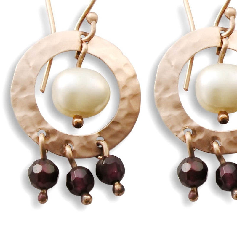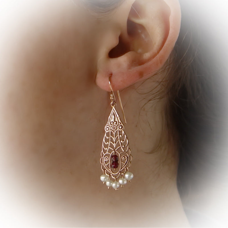 EG0795 Rose Gold Chandelier Earrings with Garnets and Pearls
