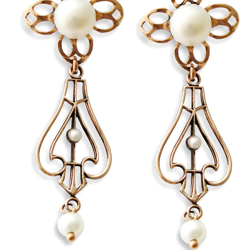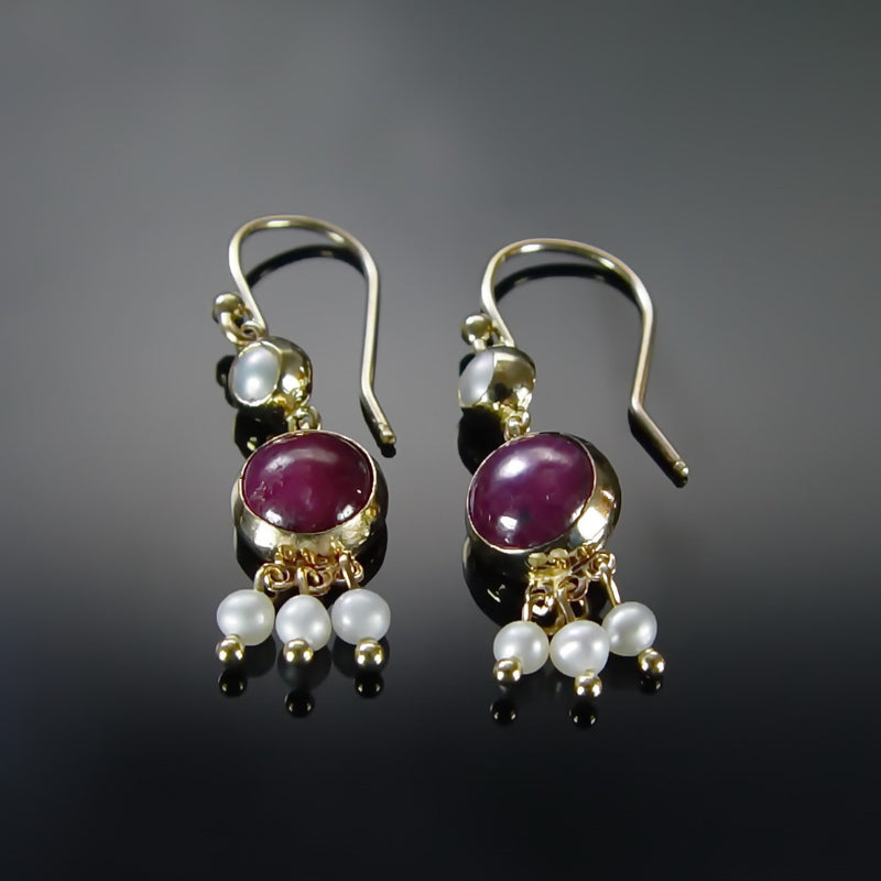 EG0759E Gold chandelier earrings with Ruby and pearls