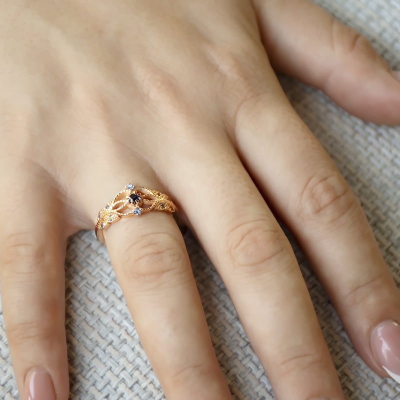 RG1911A Detailed Sapphire And Blue Topaz Statement Ring In Rose Gold Band, Vintage Ring
