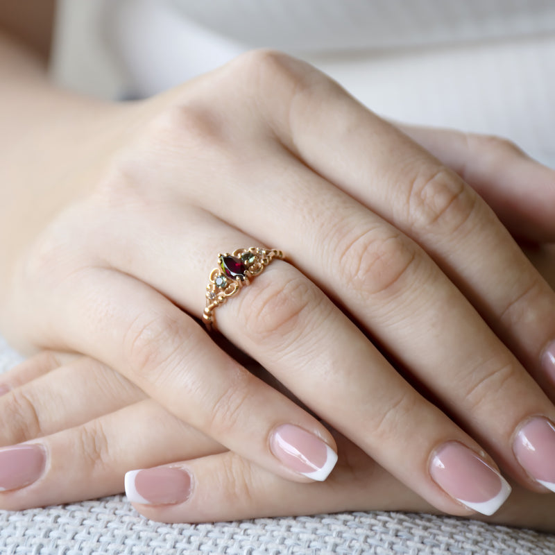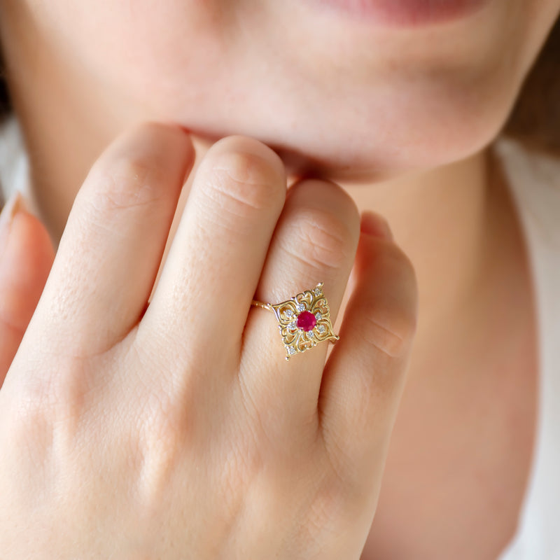 RG1945-1 Filigree Yellow Gold Ring with Ruby and Diamond Cluster, Vintage Gold Ring, Ruby and Diamonds Gold Ring