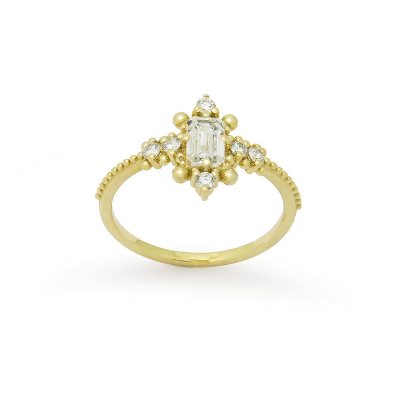 RG1914 Victorian-Inspired Gold Ring with Centered Emerald-Cut Diamond and Accent Diamonds