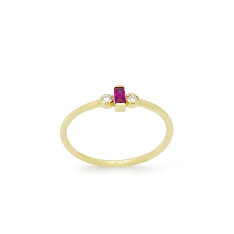 RG1917-2 Modern Baguette Lab Ruby And Diamond Engagement Ring In Yellow Gold