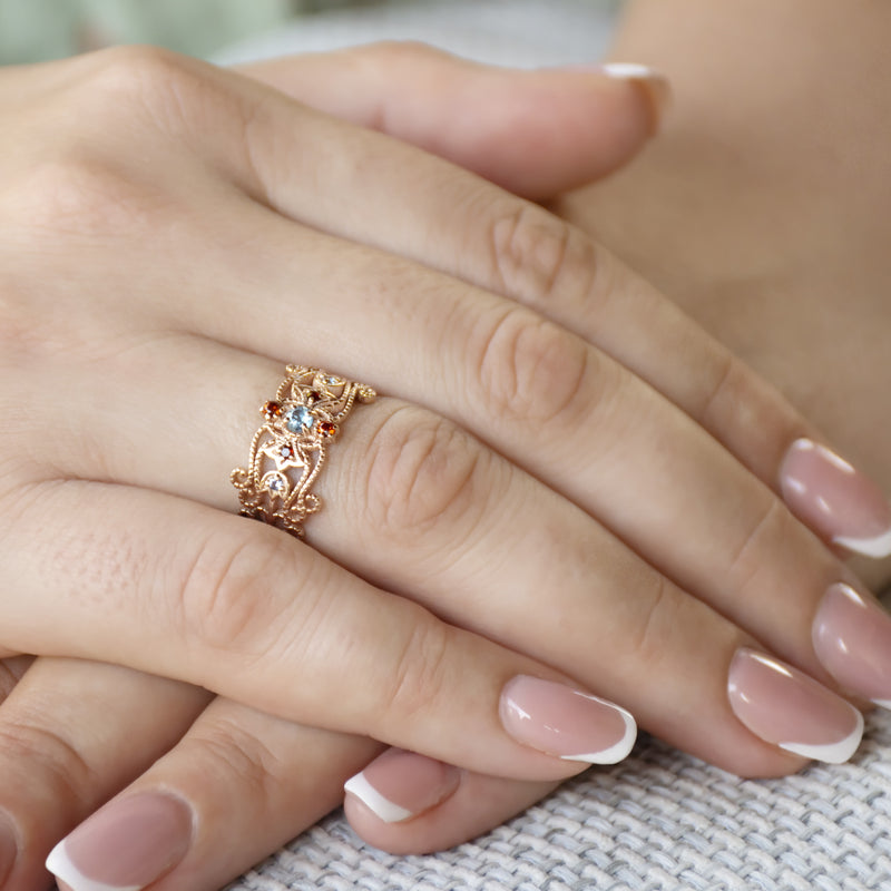 RG1918A Ornate Garnet And Blue Topaz Cocktail Ring In Rose Gold Setting, Vintage Ring