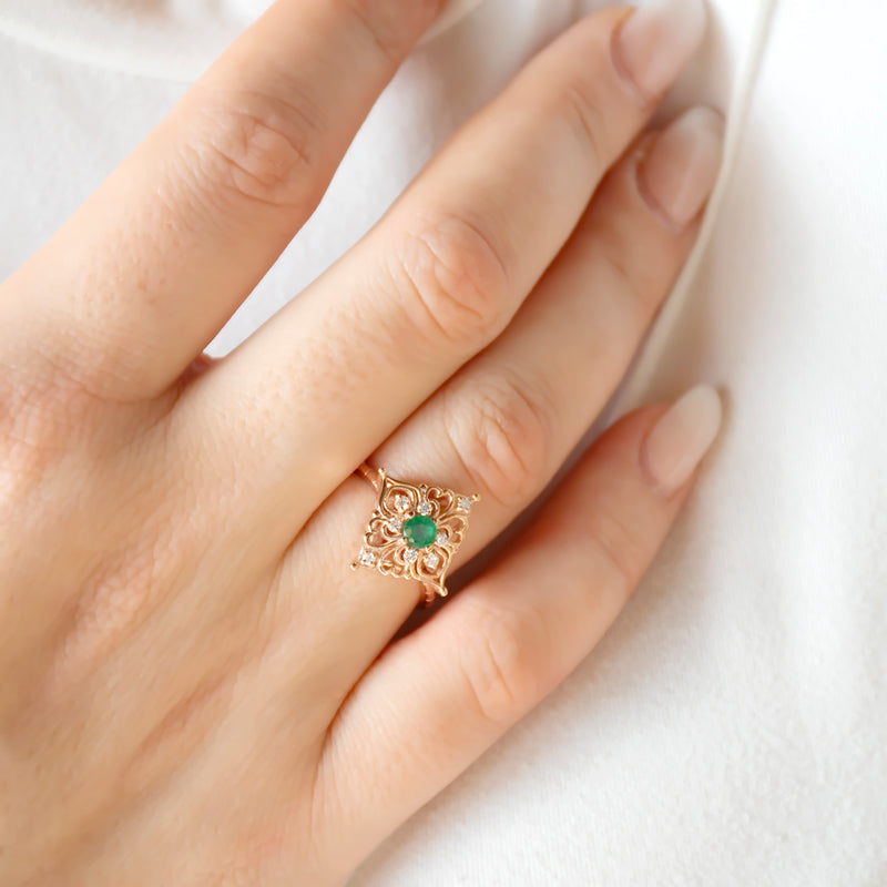 RG1945 Filigree Rose Gold Ring with Emerald and Diamond Cluster, Vintage Gold Ring, Emerald and Diamonds Gold Ring