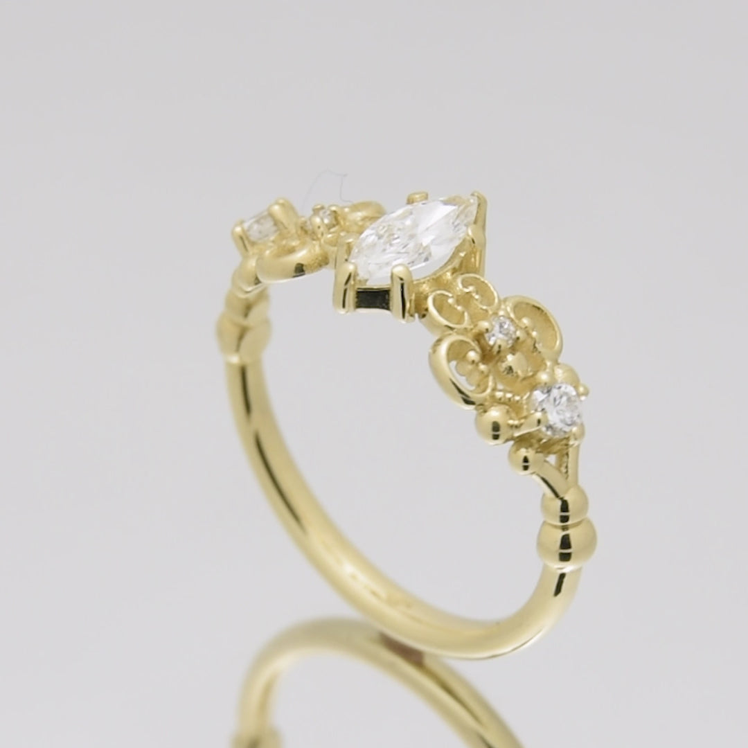 Elegant Gold Ring featuring a captivating marquise diamond at its center. Enhanced with delicate Victorian motifs meticulously crafted on the sides, this ring exemplifies exquisite attention to detail. With its timeless design and meticulous craftsmanship, this piece is a perfect blend of sophistication and classic charm, sure to be cherished for generations to come.