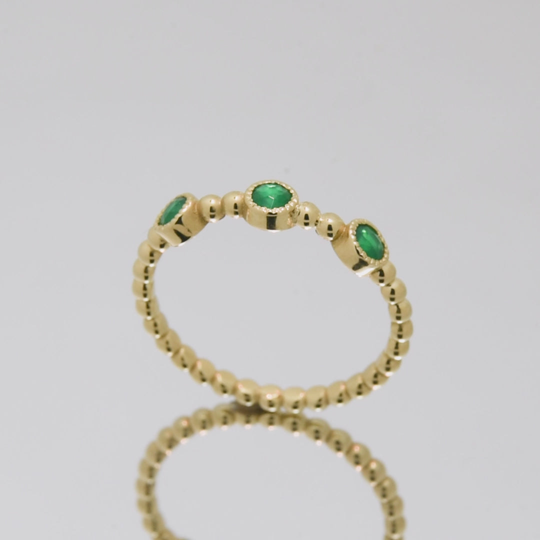 Adorned with three lush emeralds set in a delicate dotted gold band, this exquisite ring captures the essence of timeless elegance. Whether stacked with other rings or worn alone, it adds a vibrant pop of green and a hint of luxury to any ensemble. Comfortable for everyday wear, this ring can be crafted in gold, rose gold, or white gold, and customized with different gemstones to match your style.