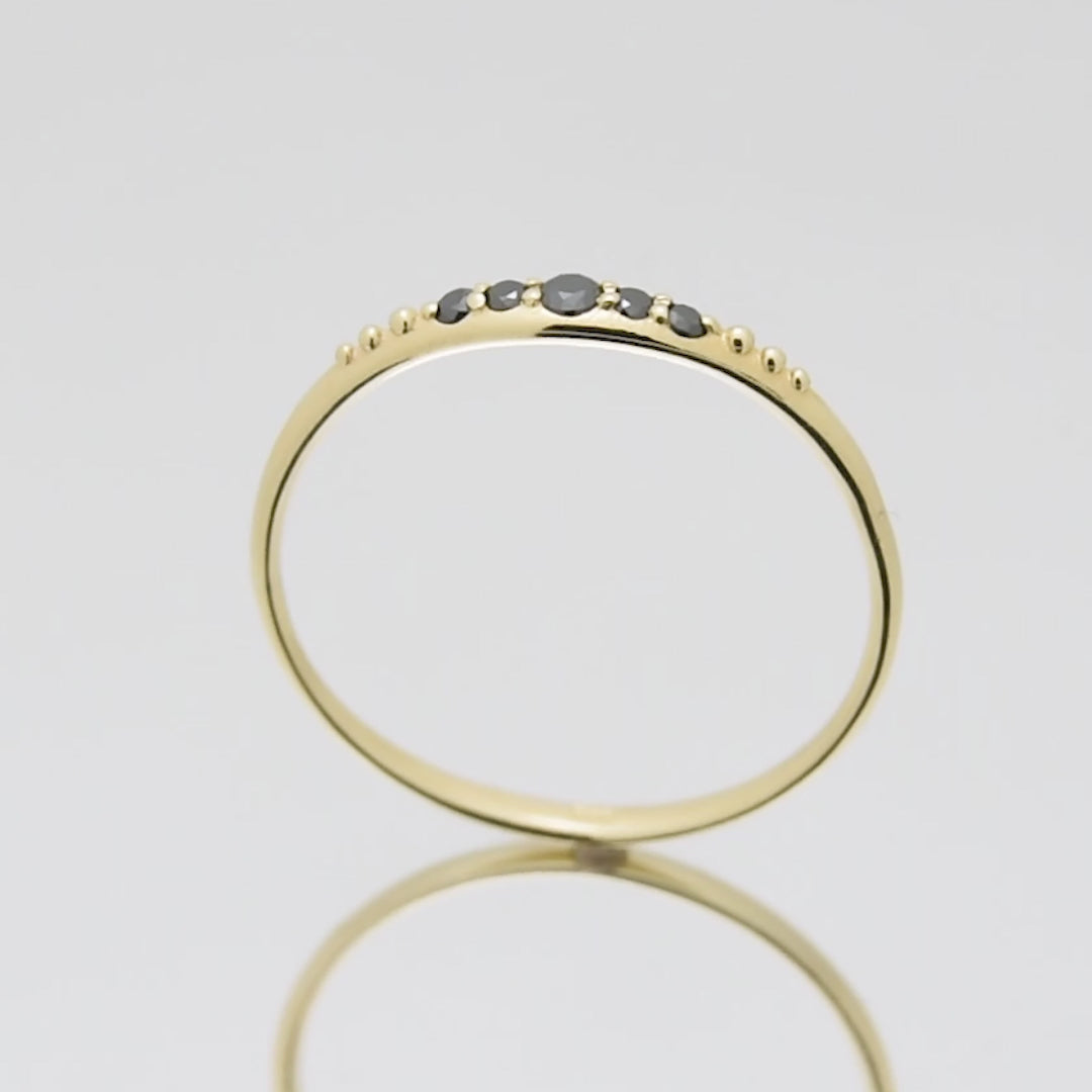 The skinny ring is meticulously crafted from shimmering 14K gold and adorned with five mesmerizing black Diamonds.