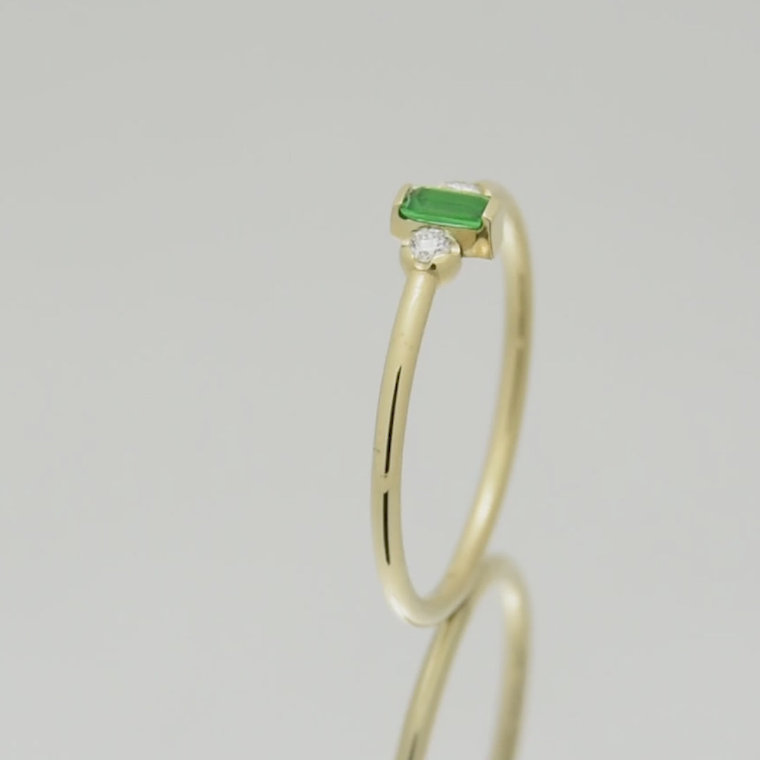 This dainty gold ring exudes elegance with its stunning design. At its center, a captivating square emerald commands attention, radiating a rich, vibrant green hue. Flanking the emerald on each side are sparkling diamonds, adding a touch of brilliance and enhancing the ring's luxurious appeal.