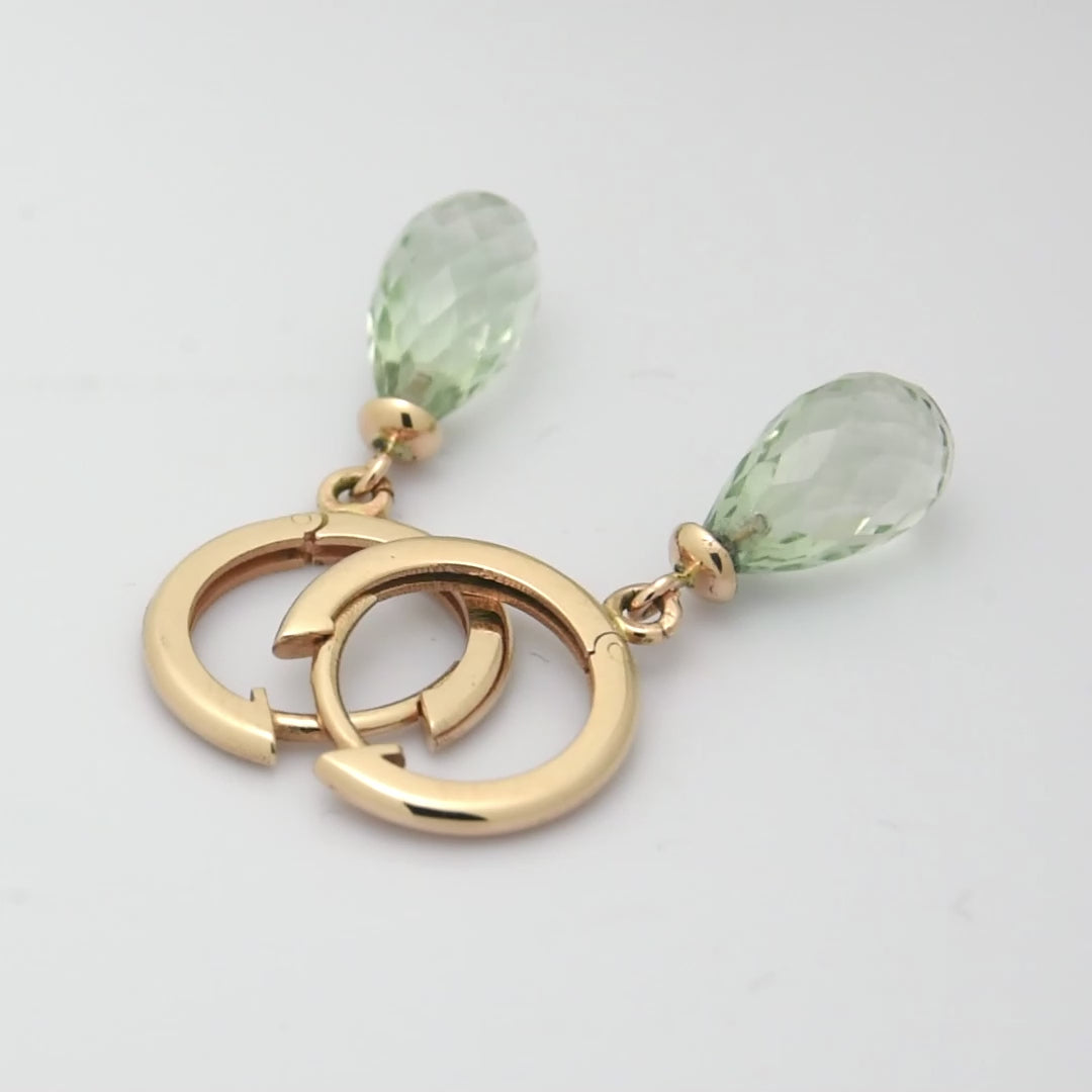 Elegant and timeless, these rose gold hoop earrings feature stunning faceted green amethyst drops, adding a touch of sophistication and charm. The soft blush tones of the gold perfectly complement the delicate green hues of the gemstones, creating a refined and feminine look. Lightweight and versatile, these earrings are perfect for both everyday wear and special occasions.