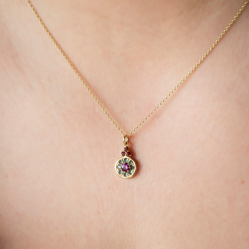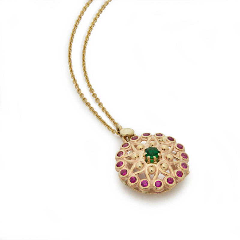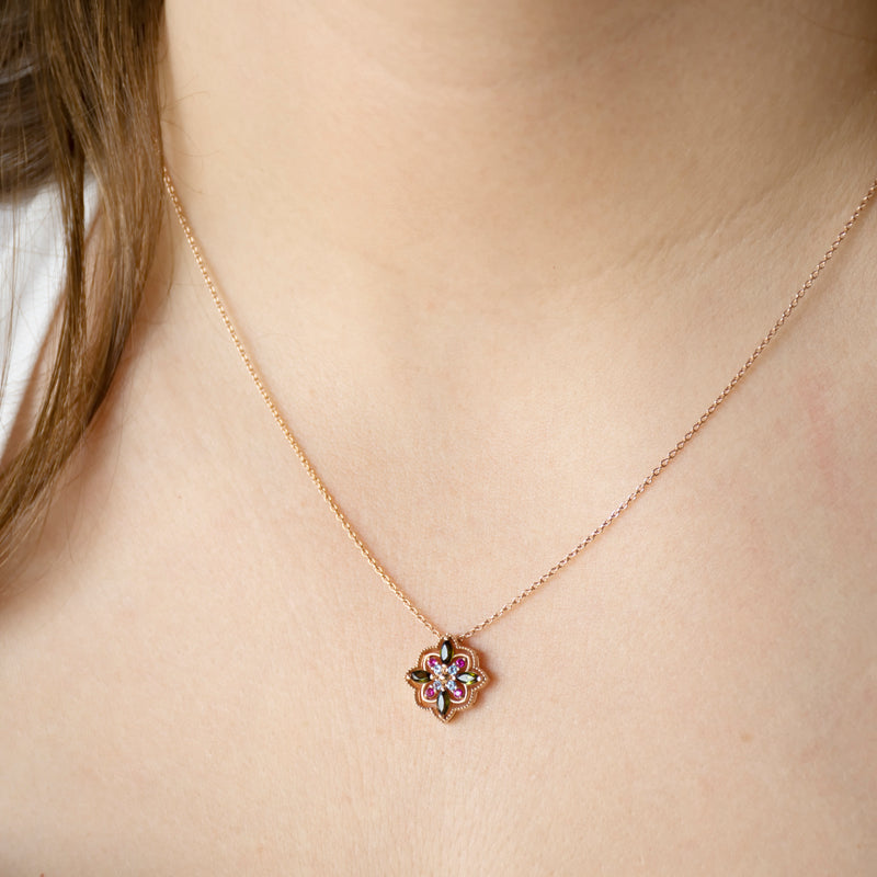 NG4804-1 Rose Gold Mandala Pendant Green Tourmaline, Blue Topaz and Ruby Pendant