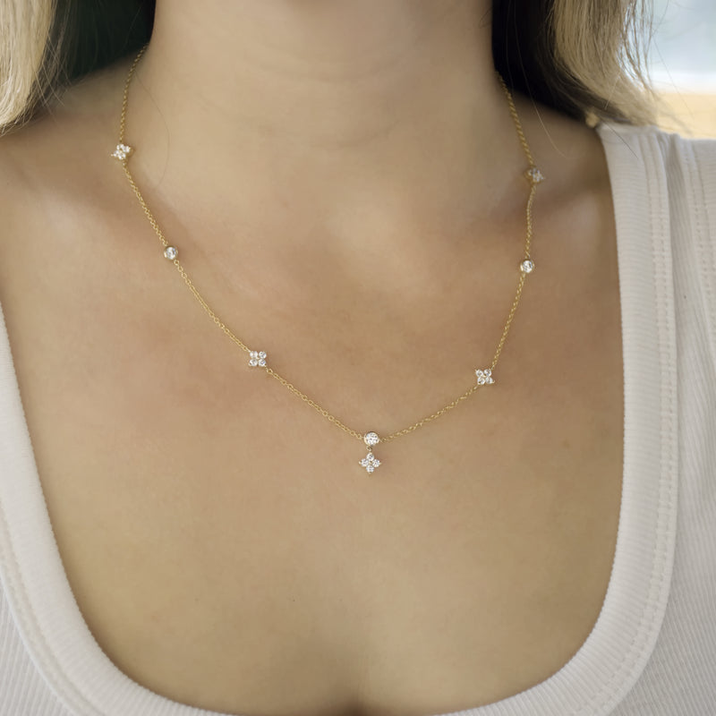 NG4780 Gold Station Necklace with Diamond-Set Flower Charms