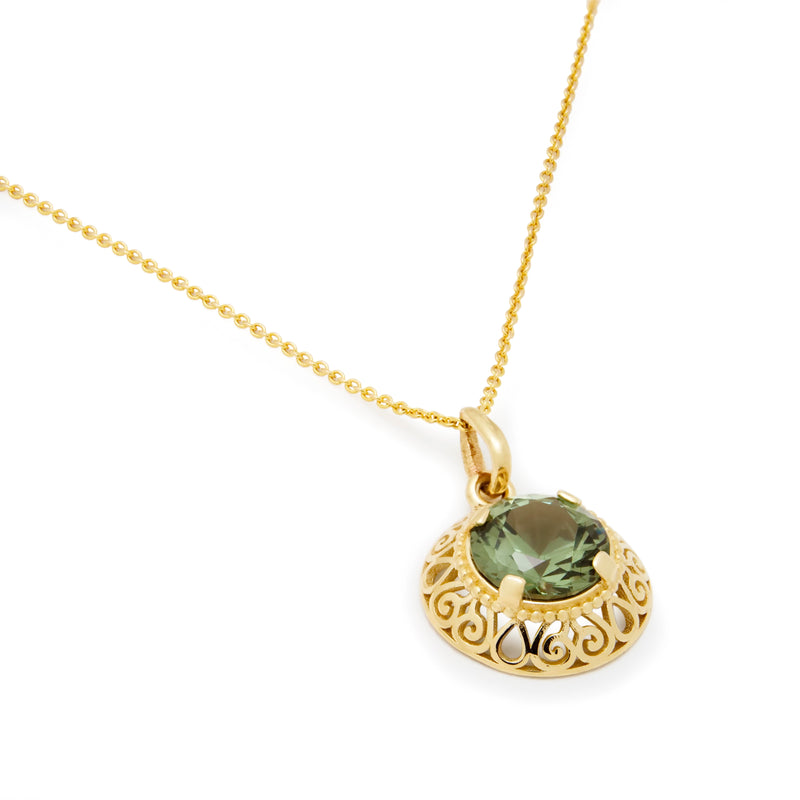 NG4791-1 Elegant Green Spinel Pendant Necklace in Yellow Gold with Intricate Filigree Detail