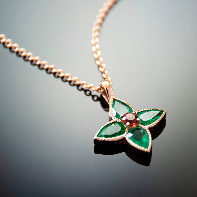 NG4797-1 Rose Gold Clover Pendant Necklace with Emerald and Garnet