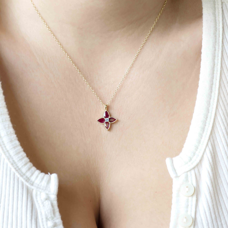 NG4767 Gold Flower Charm Necklace with Emerald and Ruby
