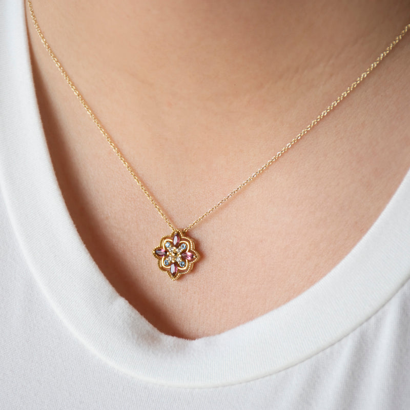 NG4804 Yellow Gold Mandala Pendant Necklace with Pink Tourmaline, Blue Topaz, and Diamonds Pendant