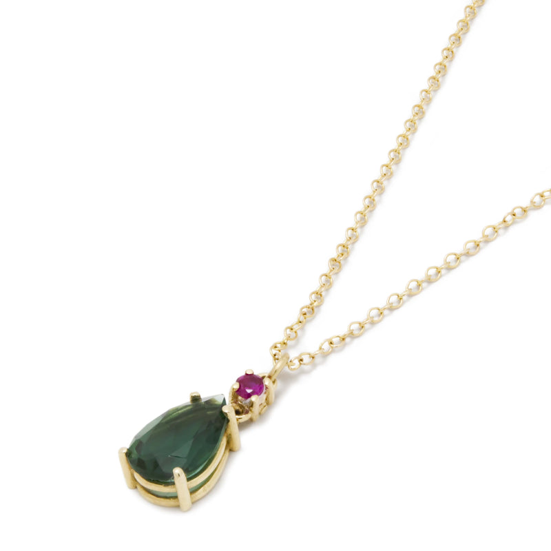 NG4805 Delicate Gold Chain Necklace With Pear-Shaped Chrome Diopside And Vibrant Ruby Accent - Elegant Gemstone Pendant Jewelry