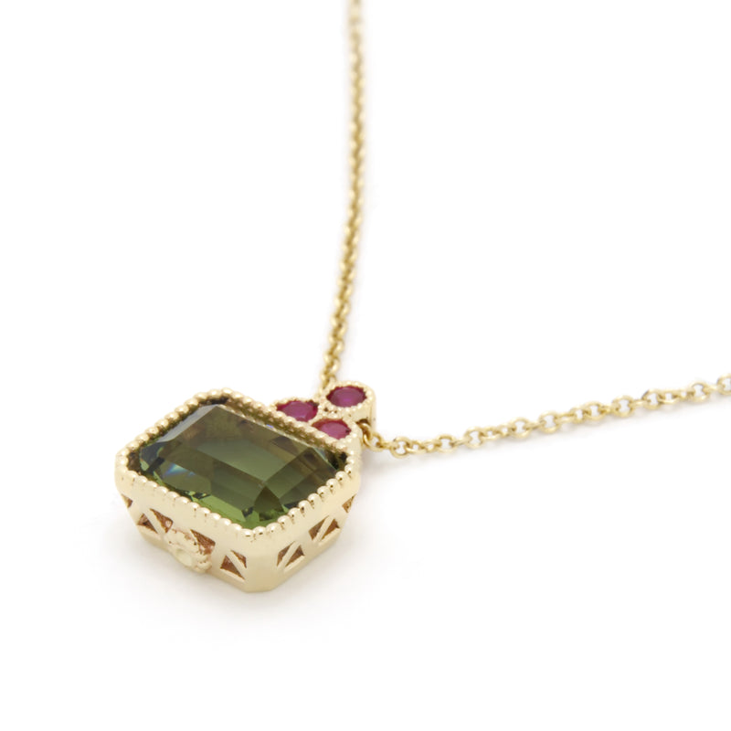 NG4755-1 Gold Charm Necklace with Square Green Spinel and Ruby