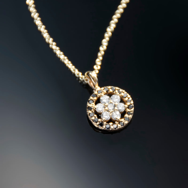 NG4775 Gold necklace with Flower Pendant set with Black and Clear Diamonds
