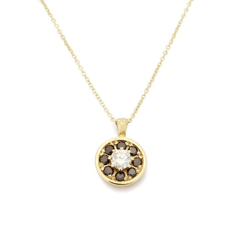 NG4776 Gold Necklace with Round Pendant set with Black and Clear Diamonds