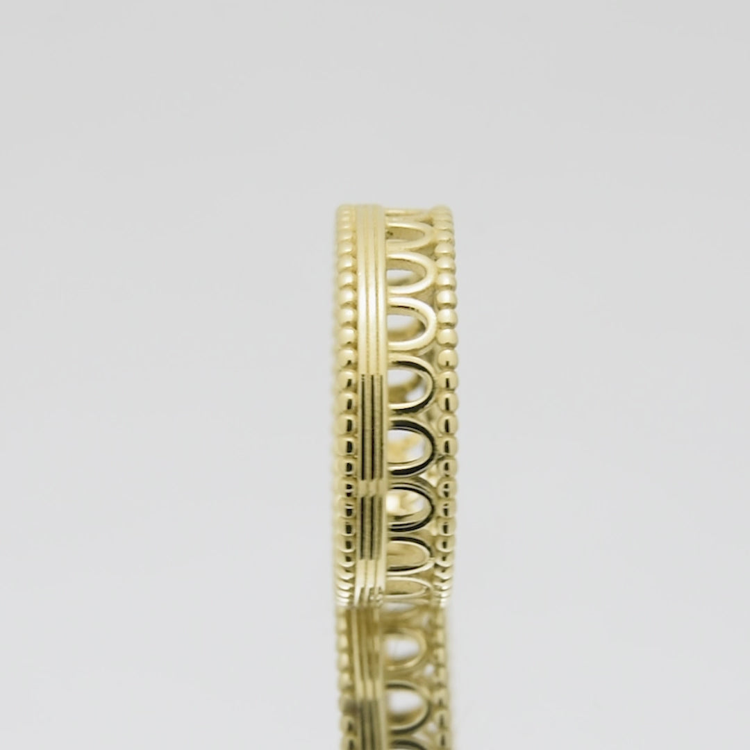 The unique design features gracefully arched accents, adding architectural charm to any ensemble. Made from high-quality gold, this durable band is perfect for stacking or wearing alone. Versatile and timeless, it effortlessly elevates any outfit for any occasion.