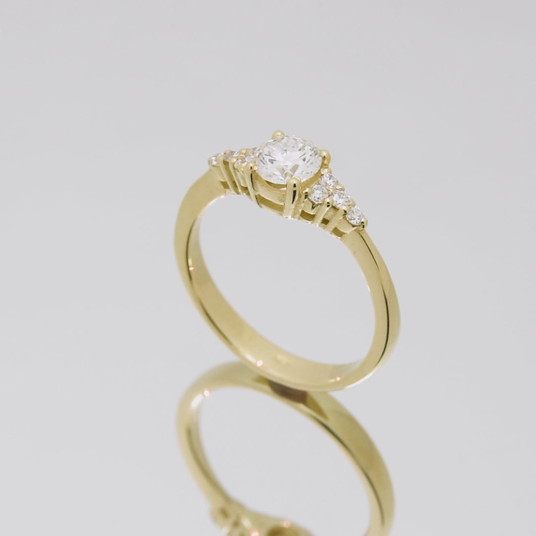 This classic gold ring embodies a minimalist aesthetic. It features a single, brilliant diamond at the center. Four smaller diamonds on each side complement the central stone, adding subtle sparkle and balance to the design. The clean, elegant lines make this ring perfect for those who appreciate timeless beauty and understated luxury.